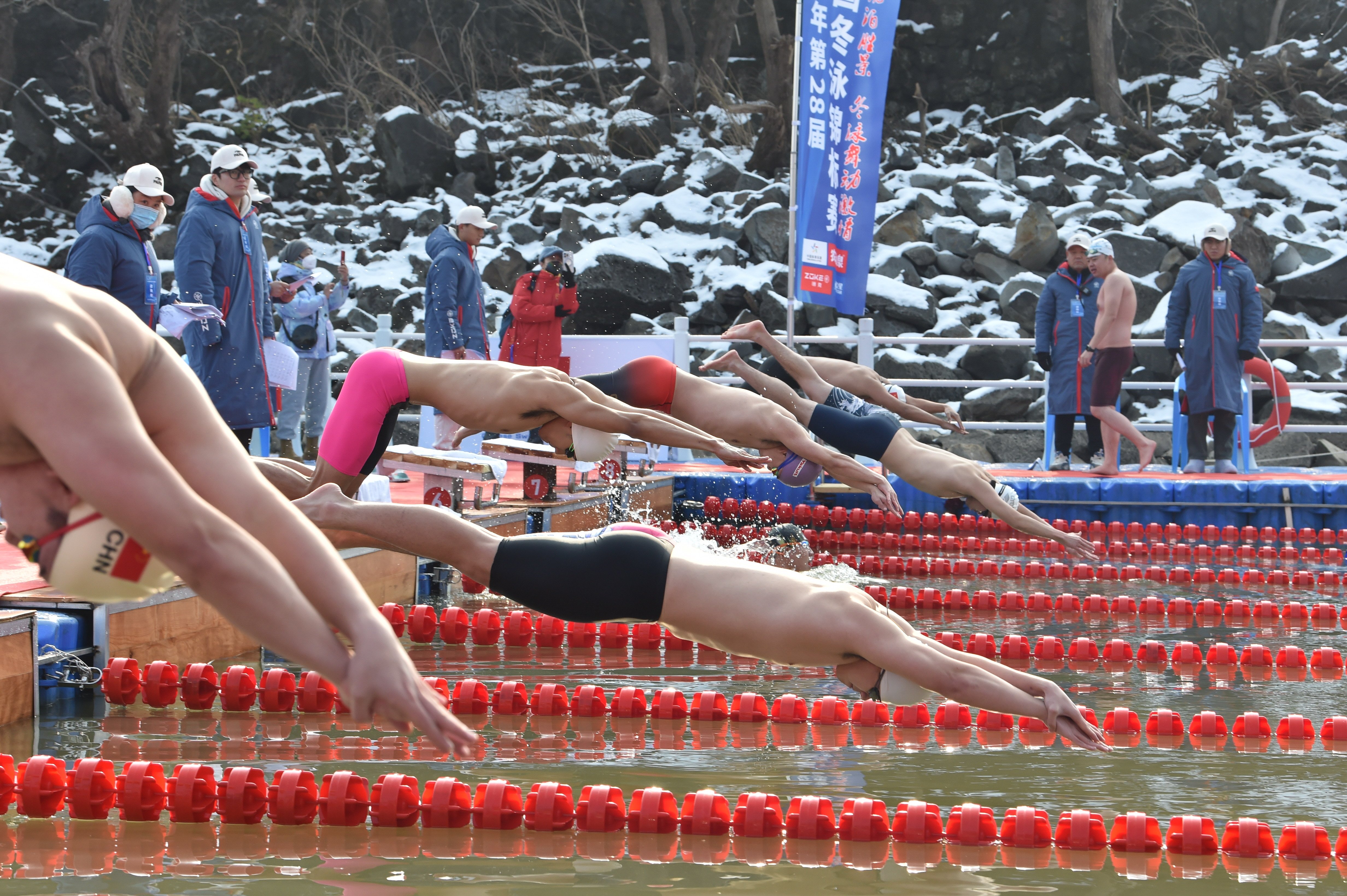 随着气哨音响,来自上海嘉定的冬泳选手崔雯芸纵身飞跃,向着终点冲刺。“这是第一次在这么冷的自然水域游泳,尤其是在秀美的景区里、壮观的瀑布下,给自己带来了难忘的崭新体验。”崔雯芸说,回去后一定邀请更多泳友来这里体验冬泳。
