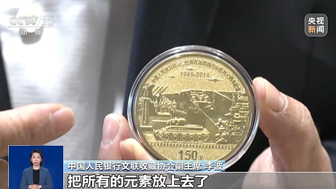 中国人民银行文联收藏协会副主席 李波:这个图案是臆造想象出来的,我觉得想象力还蛮丰富的,把所有的元素放上去了。飞机,大炮,坦克,军舰。