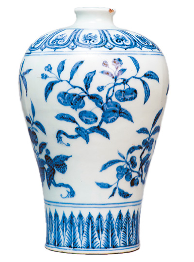 明永乐青花折枝花果纹瓷梅瓶。
