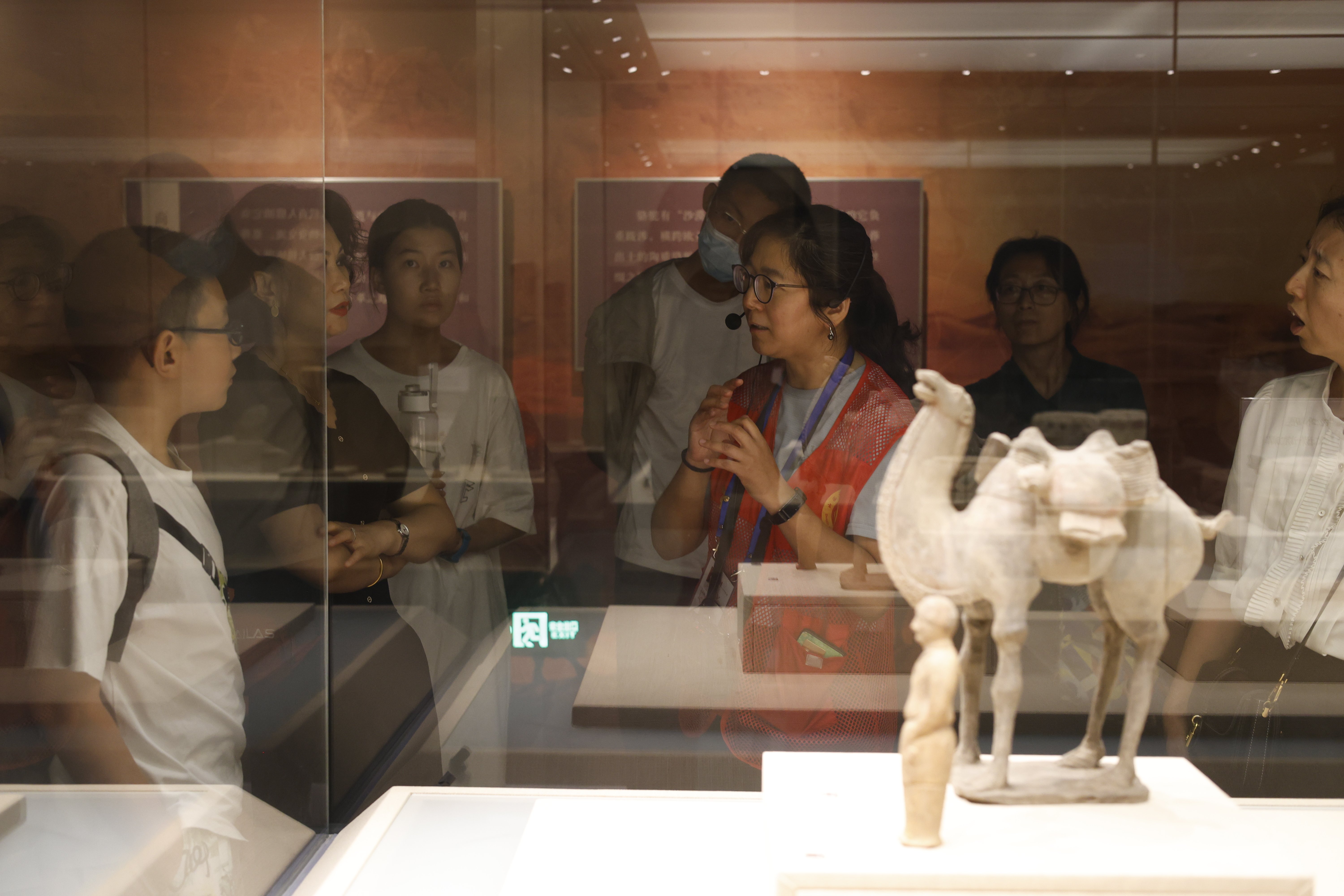 站在一面弧形墙前,娄叡墓壁画“鞍马出行图”动了起来——骑马者佩有各式兵器,或策马扬鞭,或勒缰回首,或驻马凝视,形态各异,栩栩如生。裸眼3D动画与环绕式立体声效结合,让人感觉声势浩大的出行队伍仿佛就在眼前。