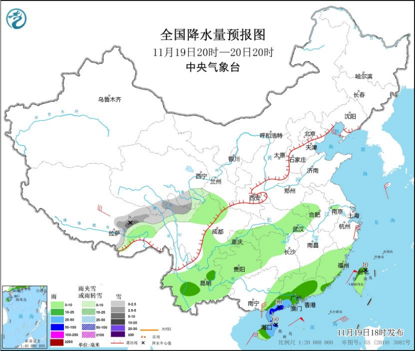 西藏东南部、青海南部、甘肃西南部、川西高原北部等地部分地区有小雪或雨夹雪,其中,西藏东南部、川西高原北部等地部分地区有中到大雪。云南西部和东北部、广东中南部、海南岛、台湾岛北部等地部分地区有中到大雨,其中,广东西南部沿海、海南岛东北部等地部分地区有暴雨。