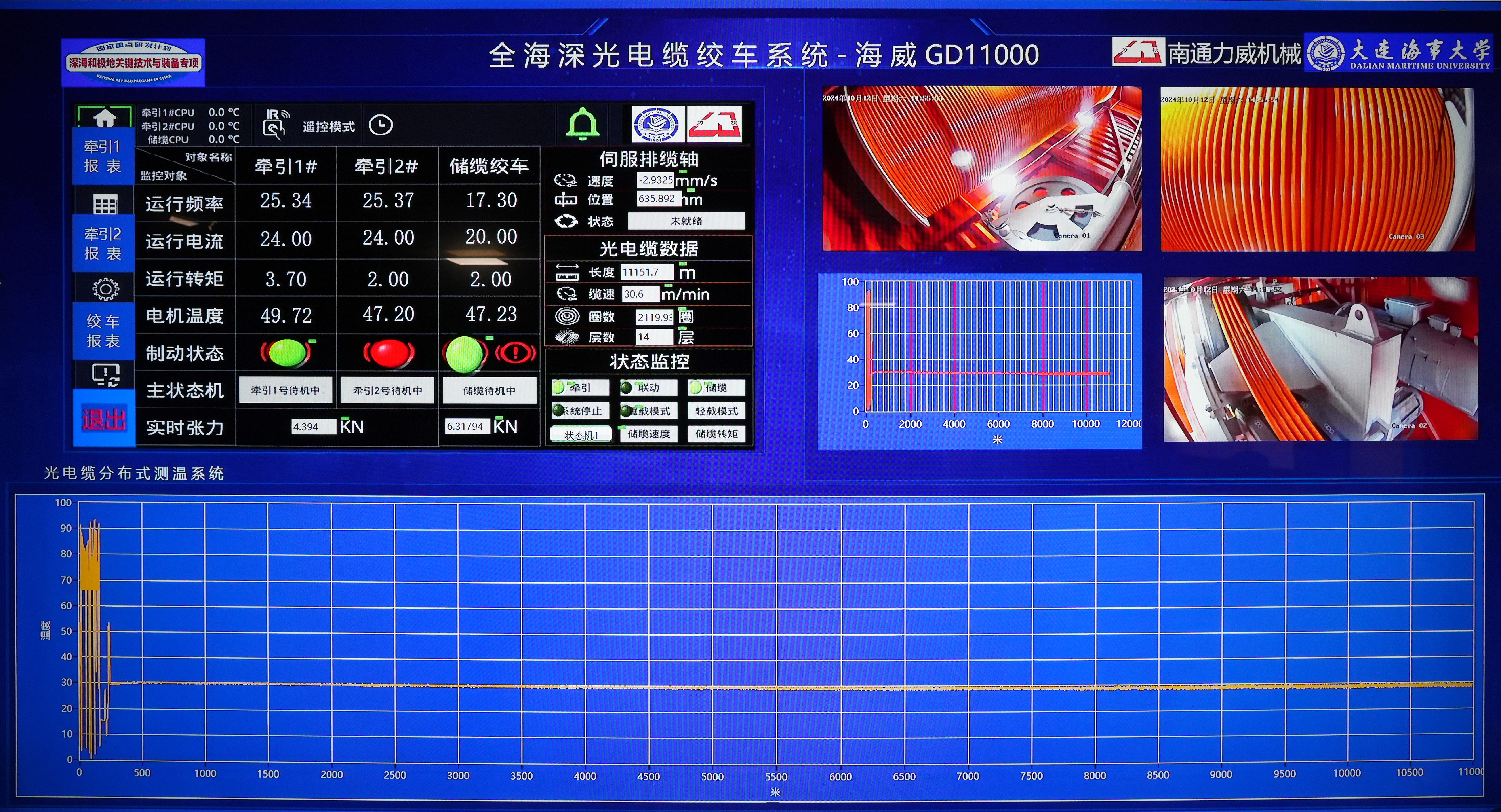 2023年12月,经交通运输部推荐,由南通力威机械有限公司牵头的国家重点研发计划“深海和极地关键技术与装备”重点专项“全海深光电缆绞车系统与全海深CTD绞车系统研制及示范应用”项目获科技部批复立项,大连海事大学李文华教授担任项目首席科学家。依托大连海事大学科技部“海底工程技术与装备国际联合研究中心”、辽宁省船舶机电一体化重点实验室和大连市深海资源开发高端装备设计优化与健康评估重点实验室等平台,联合南通力威机械有限公司、江苏亨通华海科技股份有限公司、上海交通大学、自然资源部北海发展研究院、中国极地研究中心、中国船舶集团有限公司第七O八研究所、哈尔滨工程大学、浙江四兄绳业有限公司、上海中车艾森迪海洋装备有限公司开展技术攻关,解决了深远海科考作业光电缆绞车系统存在传统金属铠装缆自重过大、超大容量缆绳排缆乱卷缠绕等问题,重点研究非金属铠装缆多层堆叠缠绕受力形变、出力效率提升与热累积效应下载流量限制及动态疲劳光纤传输控制、超长光电缆电-磁-热多场耦合特性等科学问题,突破了全海深科考绞车系统设计优化技术、多支数纤维铠装扭矩平衡设计技术及纤维层铠装和编织出力效率提升技术、全海深科考绞车系统复杂环境适应性与载荷适配性技术等关键技术,于2024年6月成功研制出“海威GD11000”,并顺利通过车间陆上联调试验。2024年10月,“海威GD11000”随广州海洋地质调查局“海洋地质二号”船在我国南海完成了首个航次的深海调查任务,在作业水深大于4000m海域完成了两次深海拖曳作业,放缆长度均超过11000米,最大放缆长度达11228.7m;同时完成了两次ROV海底观察、投放标志物和取样示范应用,充分验证了该系统对深海拖曳和ROV作业的支撑能力。