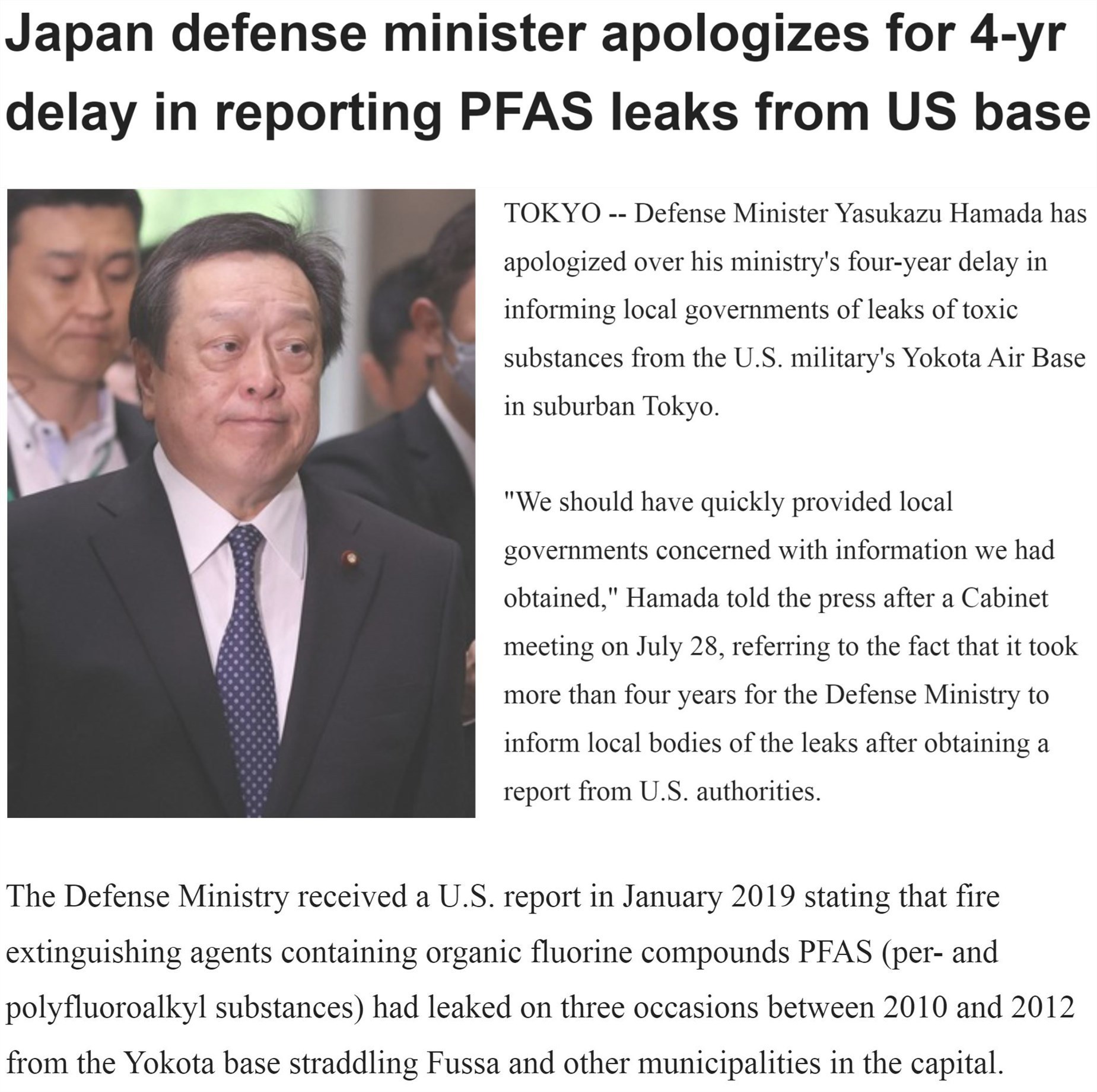 日本《每日新闻》:2023年7月28日,日本时任防卫大臣滨田靖一为推迟四年才报告美军基地有机氟化物泄漏事故道歉。