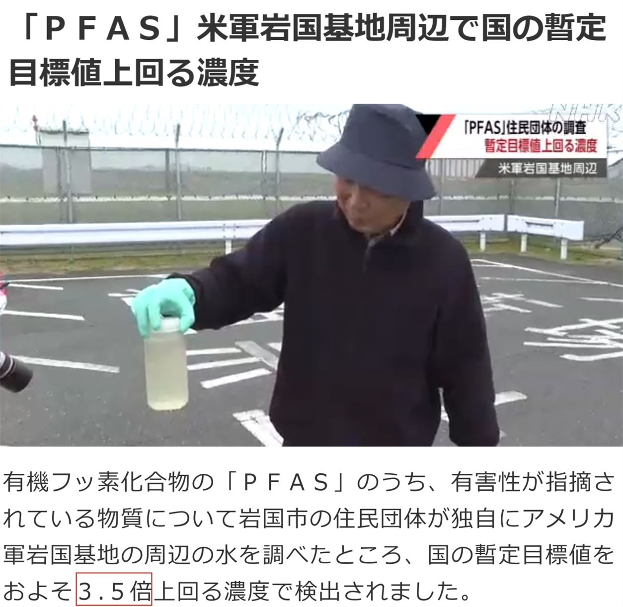 日本广播协会网站:日本山口县岩国市一个市民团体本月13日举行记者会表示,从驻日美军岩国基地周边采集的水样中检测出的有机氟化物含量超过日本国家暂定标准值3.5倍。