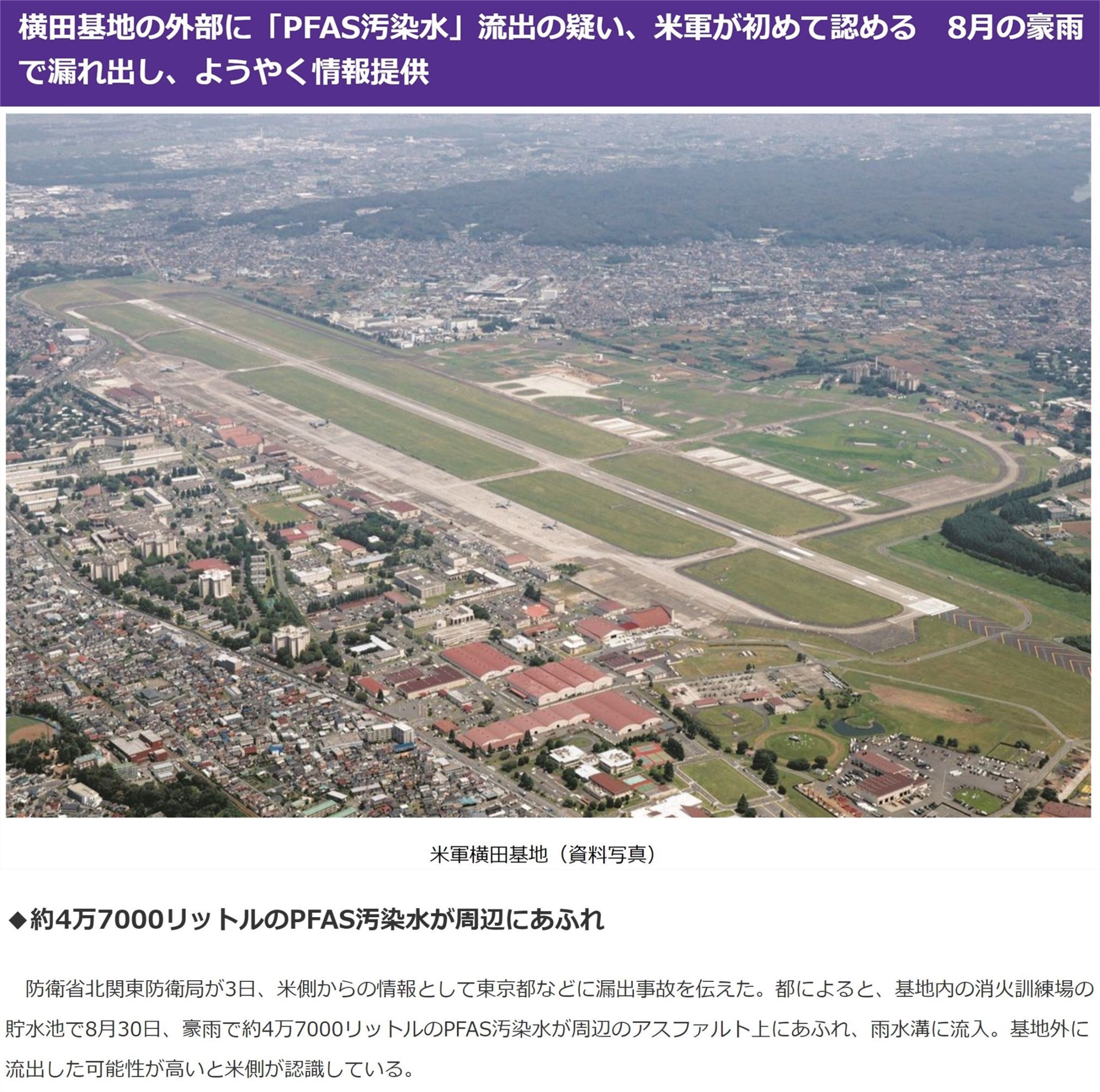 直到今年8月底的强降雨导致东京都多摩地区的美军横田基地数万升含有机氟化物污水溢出,自觉“瞒不住了”的美军方面才首次承认“可能发生污水流至基地外部的情况”。