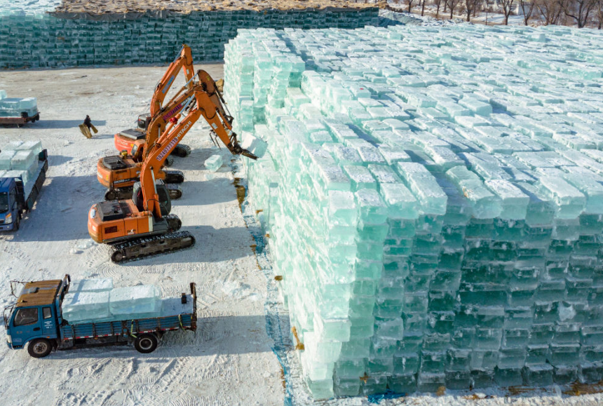 1月19日,工人操控机械在哈尔滨冰雪大世界存冰场码放冰垛(无人机照片)新华社记者 谢剑飞 摄
