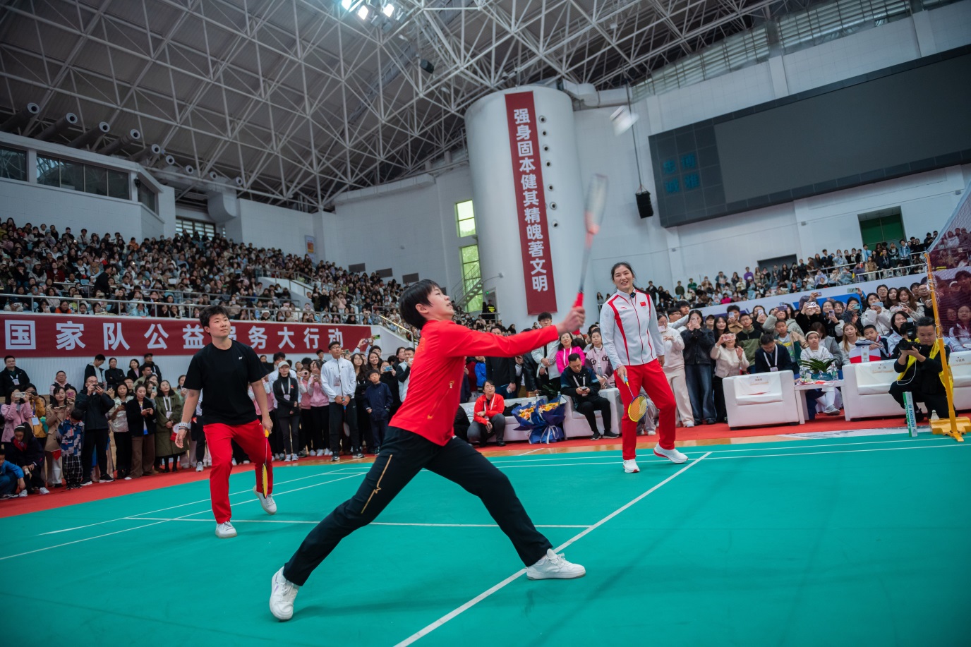 在羽毛球表演赛中,华师师生与奥运健儿们搭档对战,双方你来我往、配合默契,现场气氛达到高潮。