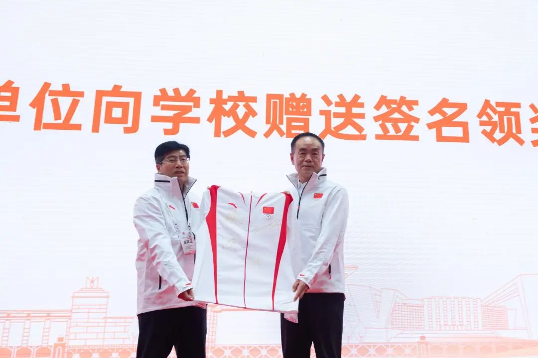 于建勇在致辞中表示,大学时光是学习本领,形成人生观、价值观的重要阶段,希望活动能将奥运精神传递给每一位同学,不仅在体育领域,更要在学习、科研、社会实践、生活等各个方面展现出自强不息、奋勇争先的风貌。他代表体育总局装备中心向华师赠送了运动员亲笔签名的领奖服,并向为巴黎奥运会服务的师生团队颁发了纪念证书。中国国家队合作伙伴怡宝向学校捐赠2000箱饮用水,表达了对全体师生的关怀与支持。学校师生向运动员们赠送了书法作品并组织了文体表演,表达对中国国家队的敬意。