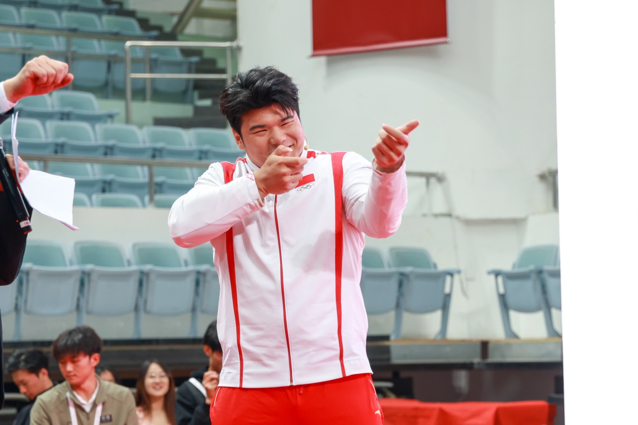 在冠军互动环节,4位奥运健儿与华师学子搭档玩起了趣味十足的“你画我猜”游戏。生动有趣的模仿,颇有默契的配合,引得现场阵阵欢呼,尽显青春活力。