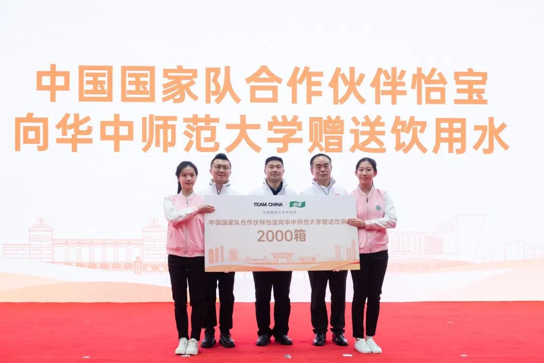 中国国家队合作伙伴怡宝向华中师范大学赠送饮用水。