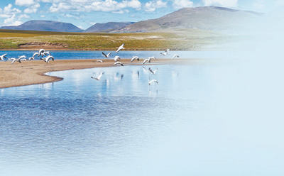 飞鸟掠过巴彦喀拉山下的湖泊。 |
