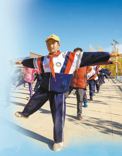 青海省海西州格尔木市长江源民族学校的学生在做操。 |