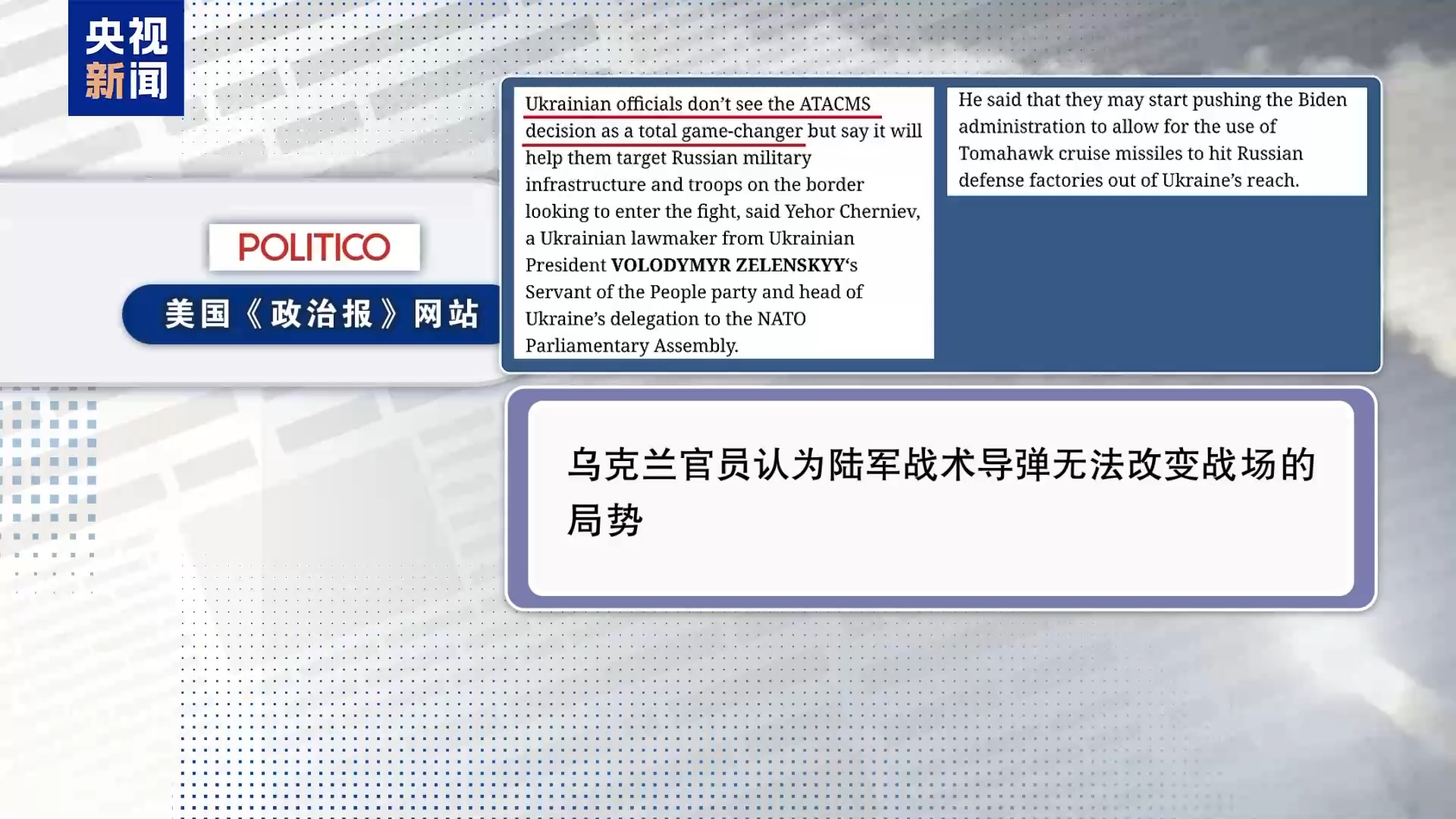 美国《政治报》网站报道称,乌克兰官员认为陆军战术导弹无法改变战场的局势,他们希望美国提供更加强大的武器。