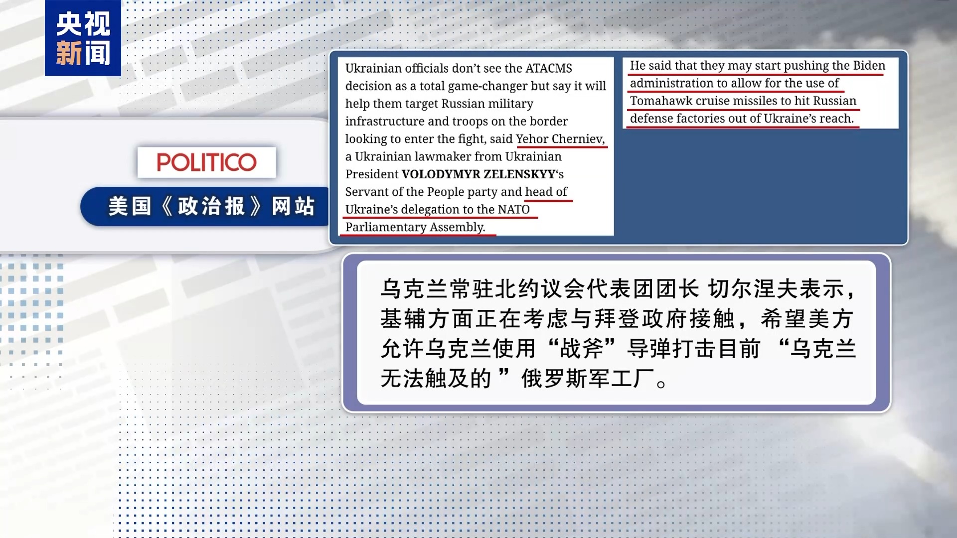 乌克兰常驻北约议会代表团团长切尔涅夫表示,基辅方面正在考虑与拜登政府接触,希望美方允许乌克兰使用“战斧”导弹打击目前 “乌克兰无法触及的”俄罗斯军工厂。他补充道,乌克兰官员担心,即将上台的特朗普政府可能会对批准此类授权更加犹豫不决,而可能会将其“作为与俄罗斯人谈判的筹码”。