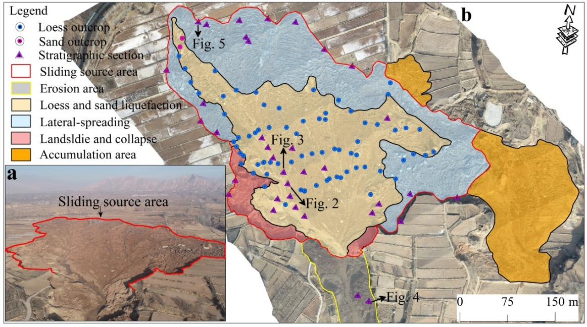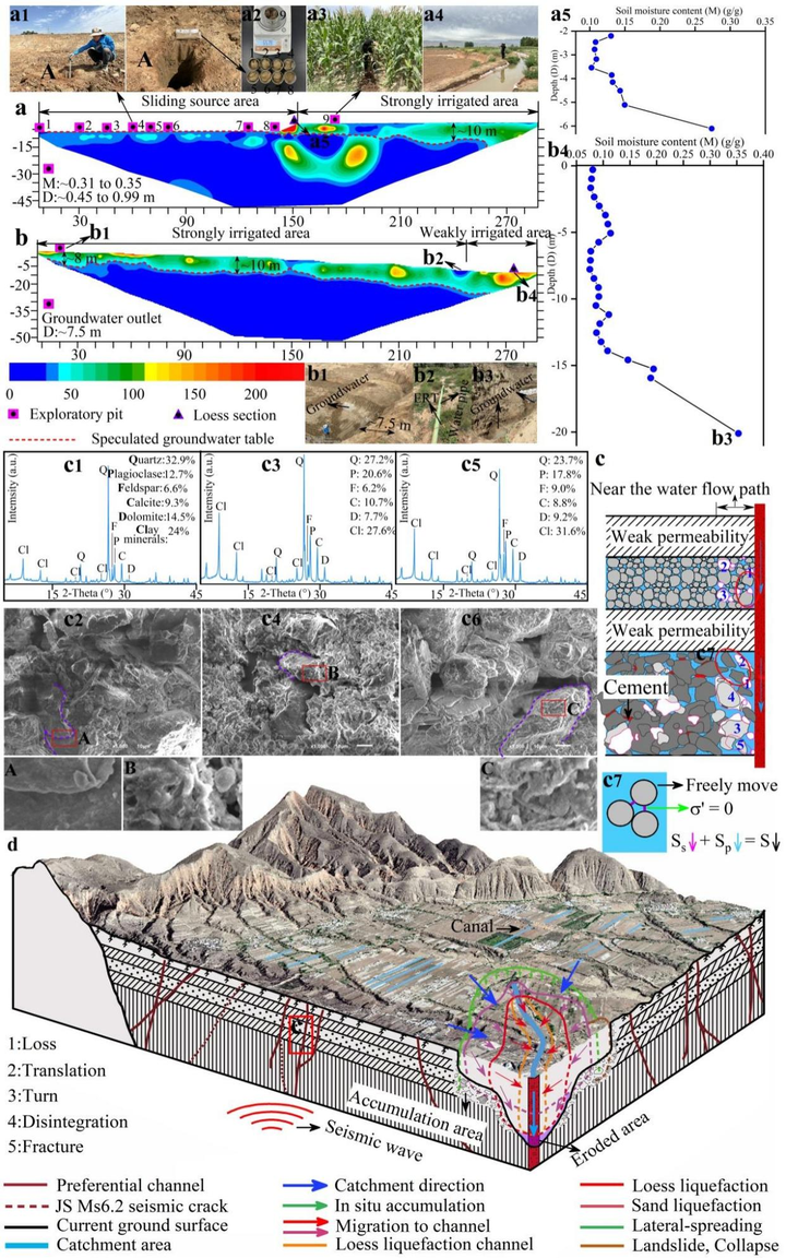 针对2023年12月18日积石山Ms 6.2级地震诱发的官亭盆地(黄河三级阶地)滑坡-泥流灾害(图3),研究结果揭示了地貌单元、构造运动和人类活动如何控制本次滑坡的形成,并发现了一种新的地震诱发的滑坡破坏模式,这类滑坡以双层液化为主,并可能广泛存在于河流阶地之上(图4)。这些研究不仅为河流阶地灌溉区潜在滑坡风险预测提供了新的理论基础,警示人们需要紧急评估构造活跃的黄土高原河流阶地灌溉区滑坡的易发性,也为类似区域平衡人地关系、开展地质灾害防灾减灾提供了新启示。