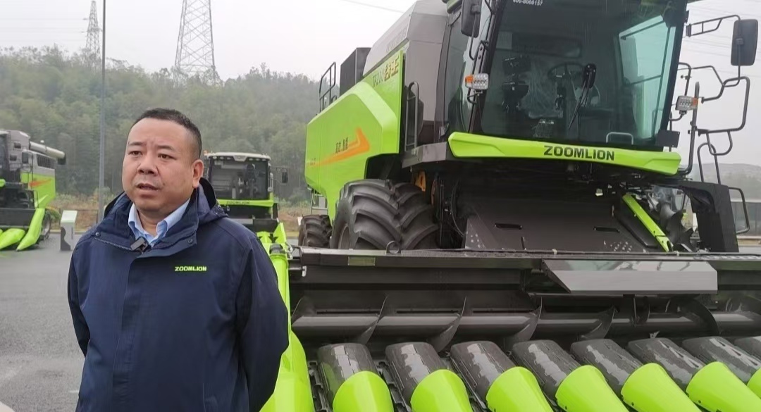中联农机联席总经理郭岗在介绍谷物联合收获机。