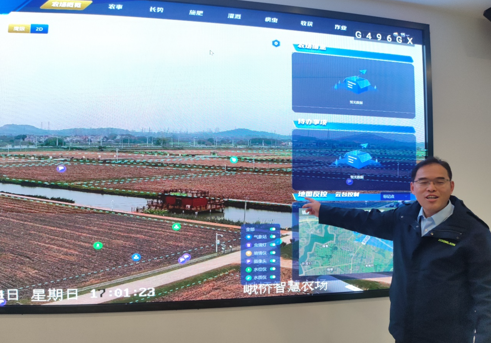 中联智慧农业股份有限公司副总工程师王昌贵在介绍中联重科峨桥智慧农场的实时状态。