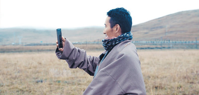 牧民在四川阿坝州若尔盖草原上通过手机移动网络与朋友视频通话。赵祖乐摄