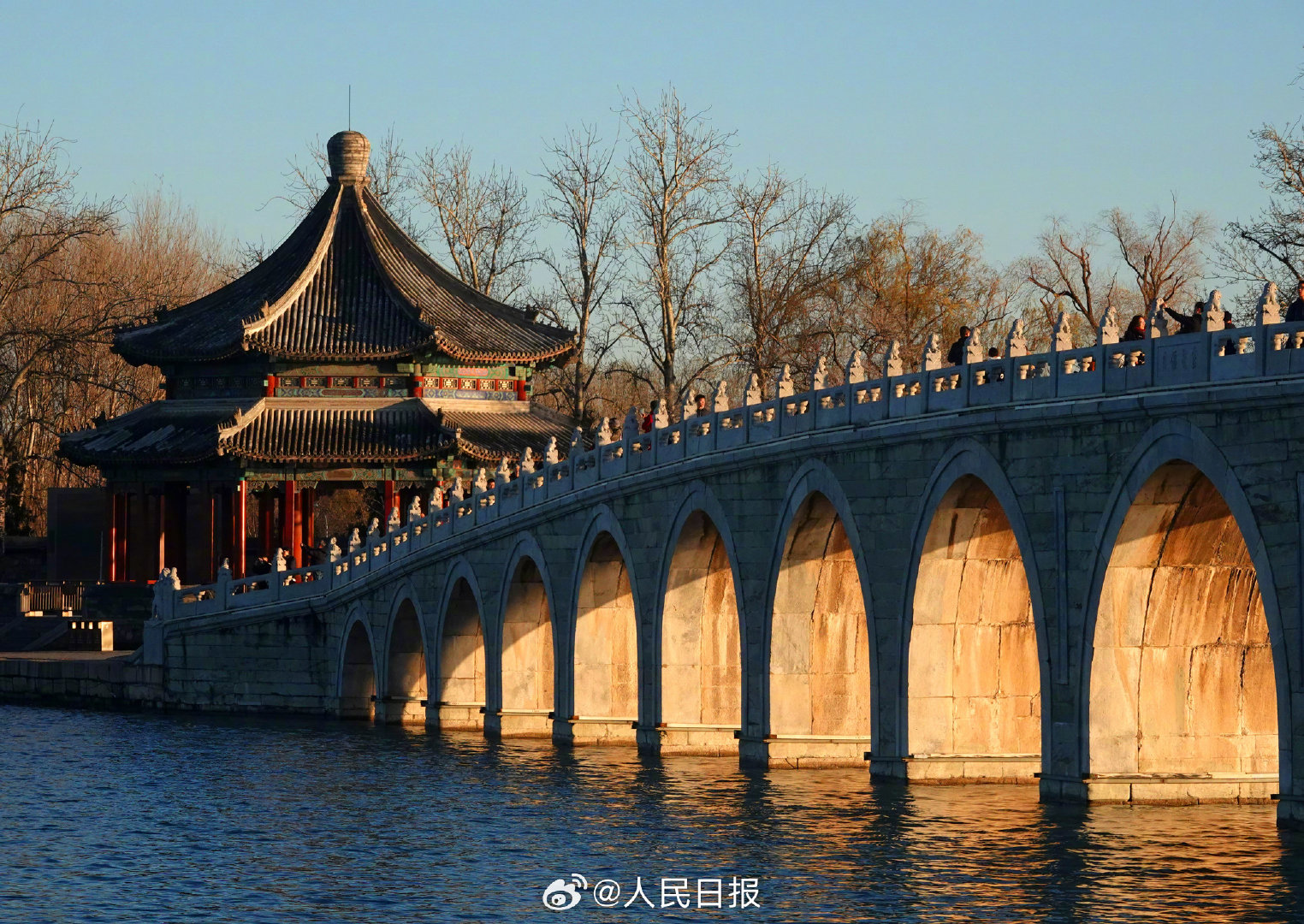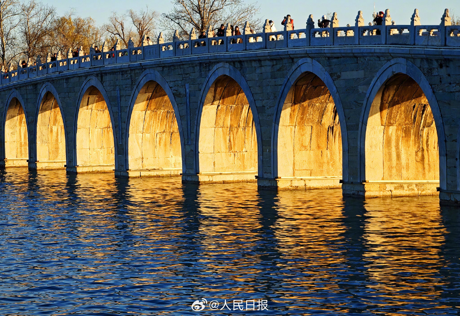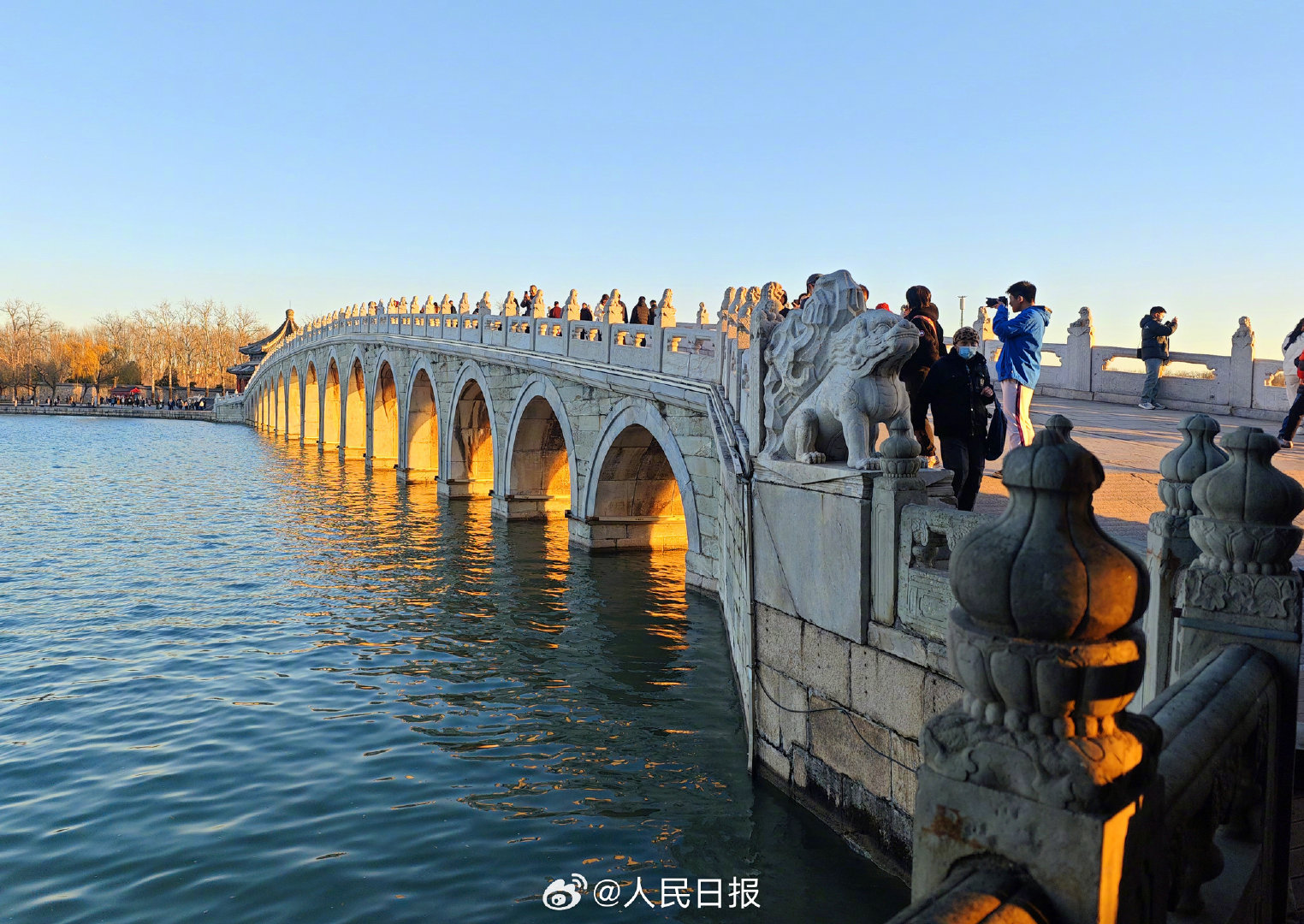 11月29日,北京天气晴好,颐和园十七孔桥再现金光穿洞,吸引许多市民和游客打卡观赏。