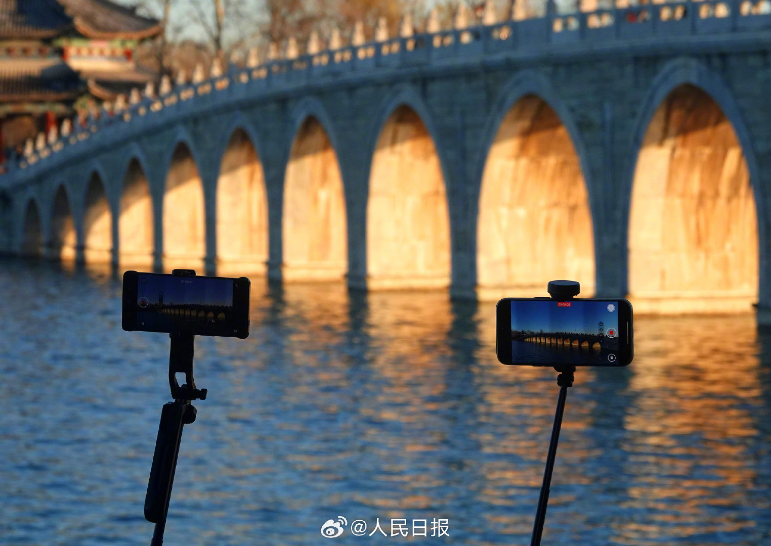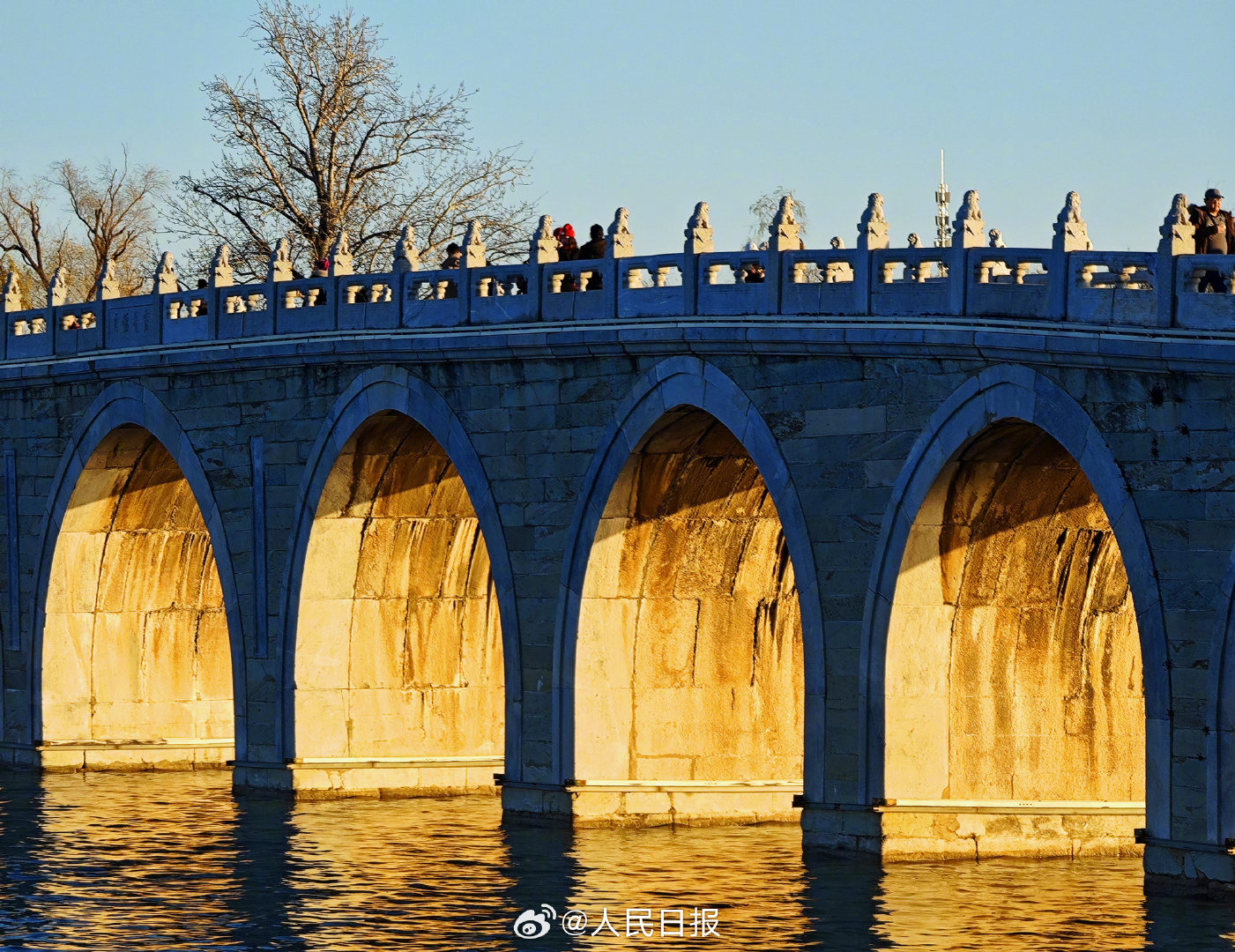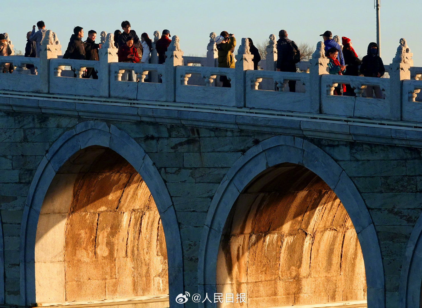 11月29日,北京天气晴好,颐和园十七孔桥再现金光穿洞,吸引许多市民和游客打卡观赏。