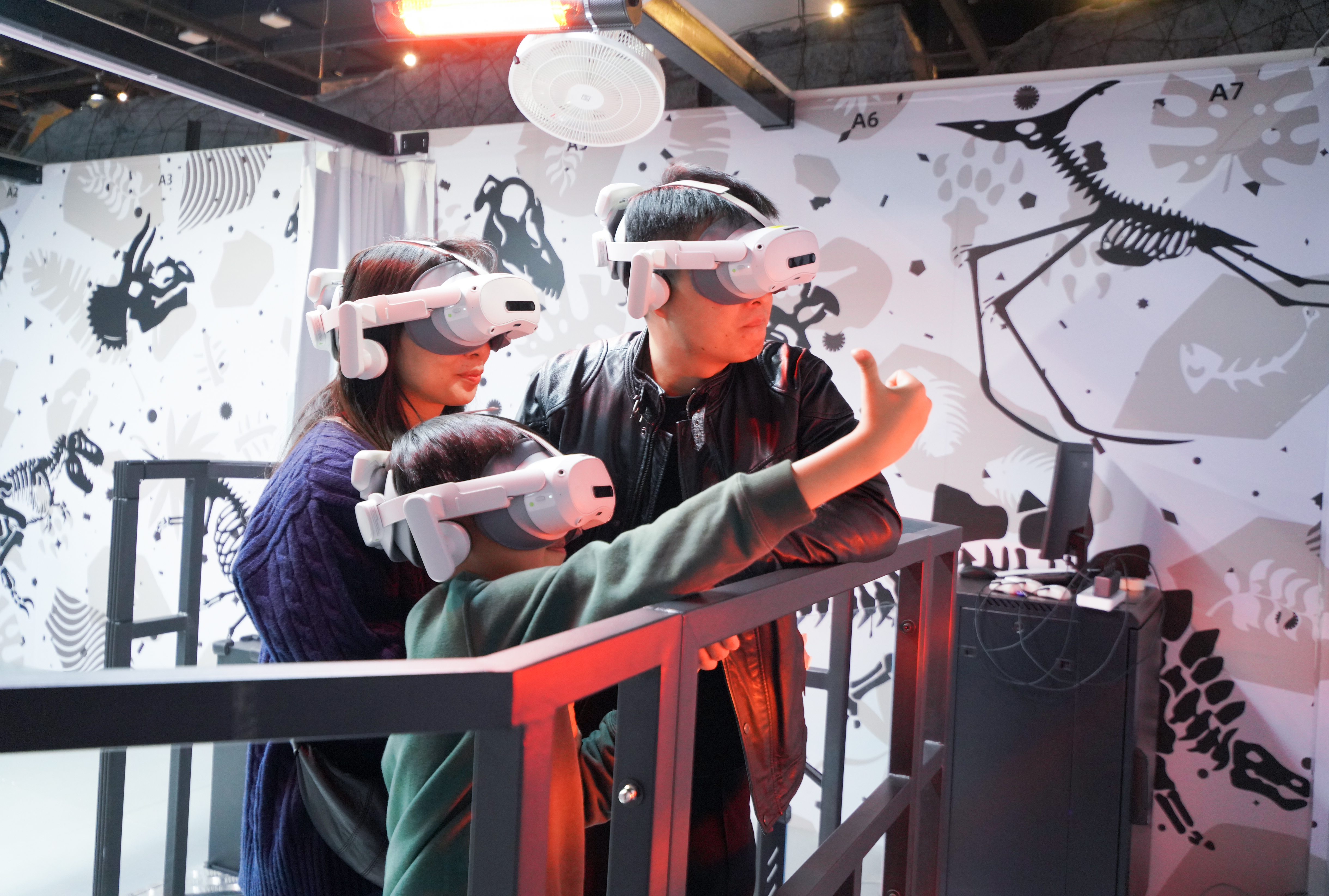 据介绍,《又见恐龙》XR嘉年华占地约940平米,包含体验区和恐龙文创区两部分,体验区大胆颠覆传统VR体验,由一个个40平米的独立体验单元“幻方”组成。在其中,观众戴上特制的XR眼镜,就能瞬间化身为勇敢的恐龙探险者,在科考队员“吕小土”带领下,和其他玩家组成科考小队,乘坐神奇的“时光电梯-小小只”,穿越中生代三纪,上天下海,遭遇腔骨龙,帮助腕龙宝宝逃脱异特龙,还将目睹白垩纪奇观,见证海洋霸主沧龙和天空霸主风神翼龙的风采。