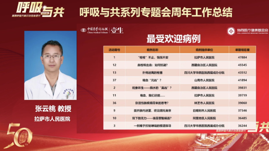 西藏医学会呼吸分会副主任委员、拉萨市人民医院呼吸与危重症医学科主任张云桃,对周年工作进行了详细总结。一年来,在全国肺栓塞与肺血管病防治协作组专家学术指导下,高原呼吸共病诊治思维提升系列专题会完成了50 期的系列病例讨论,全国参与线上直播及回看的学员超过160万人次,活动受到广泛好评。来自全国16个省、市、自治区的38家医疗中心,共72位医学专家作为嘉宾对讨论的病例抽丝剥茧;来自西藏自治区共10家医疗中心的74名专家同道,积极参与病例汇报及讨论工作。通过年度观看总量,展示了十佳“最受欢迎病例”。