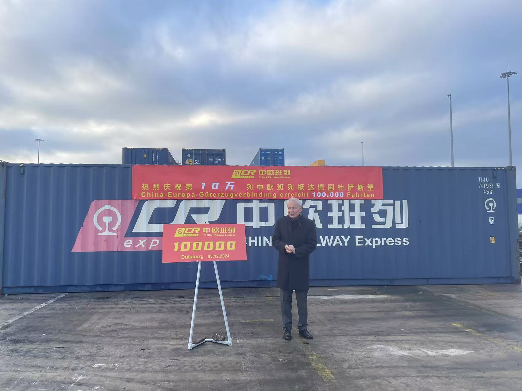 12月3日上午,第10万中欧班列接车仪式在德国杜伊斯堡多式联运场站举办。中国驻杜塞尔多夫代总领事昌海涛、杜伊斯堡市政府中国事务专员陶逸泊(Markus Teuber)、杜伊斯堡港务集团董事长马库斯·班恩(Markus Bangen)、中铁集装箱运输有限责任公司欧洲子公司总经理田中雨等出席接车仪式。