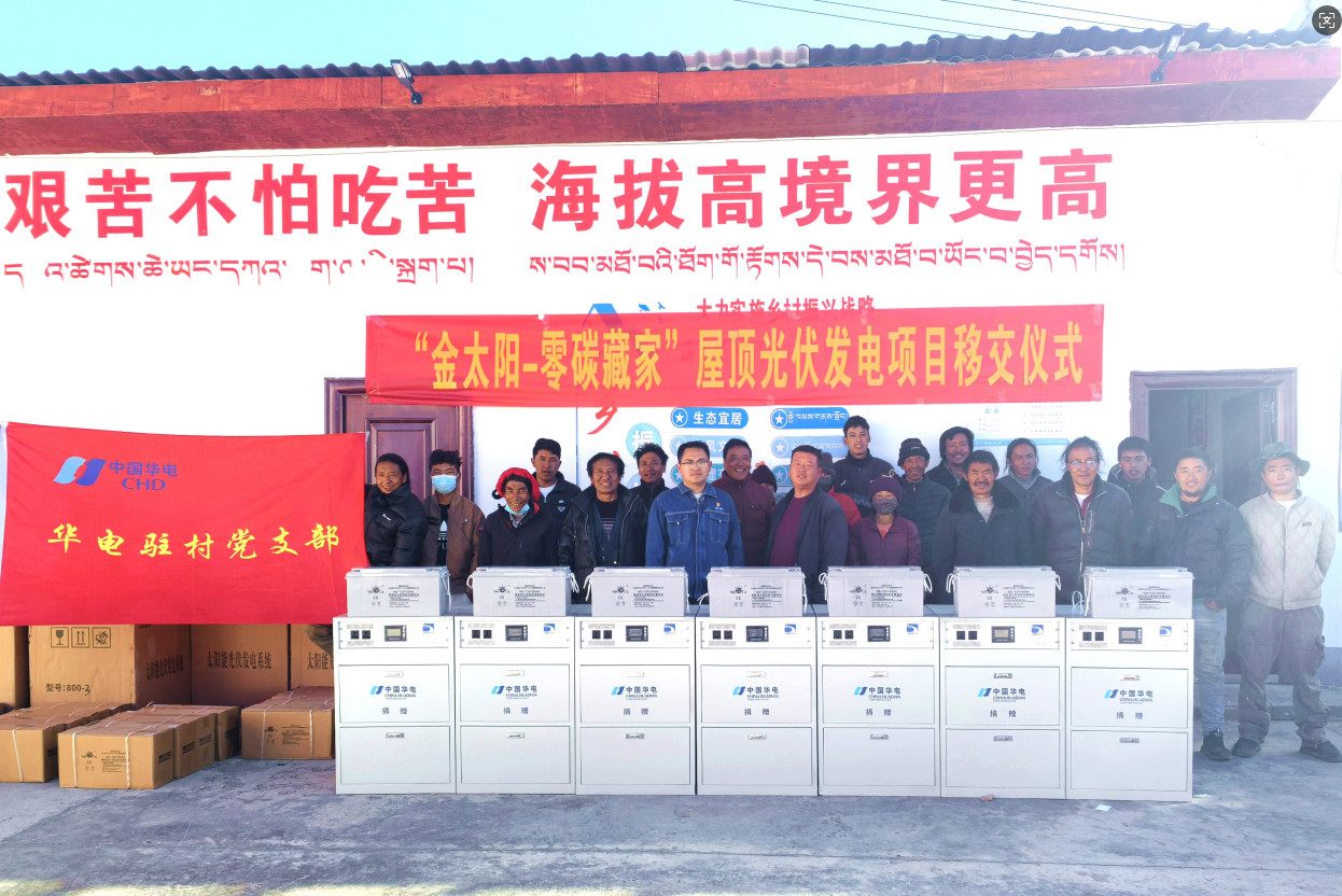 卡顶村地处海拔4200米的高原牧区,光照条件好,拥有丰富的太阳能资源,但电力基础设施相对薄弱,村民照明做饭等还面临供电稳定性不足的问题。光辉中华,福泽高原,华电西藏公司坚持抓党建促乡村振兴,发挥驻村党支部示范引领作用,着眼当地太阳能资源禀赋,因地制宜开展“光福”行动,以无偿捐赠的形式,为当地21户村民安装“金太阳-零碳藏家”离网光伏项目,让艰苦边远地区藏族家庭实现绿色用电、零碳生活。