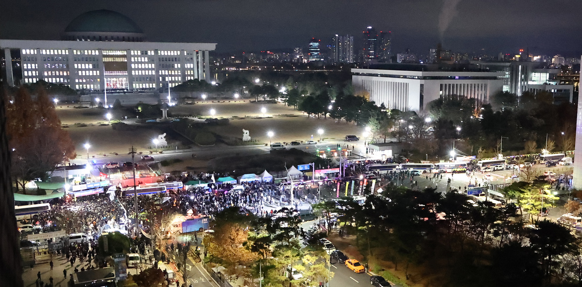 当天夜间到次日凌晨,韩国国会成了决定事件走向的关键地点。韩国国会出入口一度关闭,国会议员也不可通行。韩国在野党辅佐团和警方在国会出入口对峙。国会外聚集了大批韩国市民,大量警车将国会团团包围。试图进入国会的人群同警察正在对峙。
