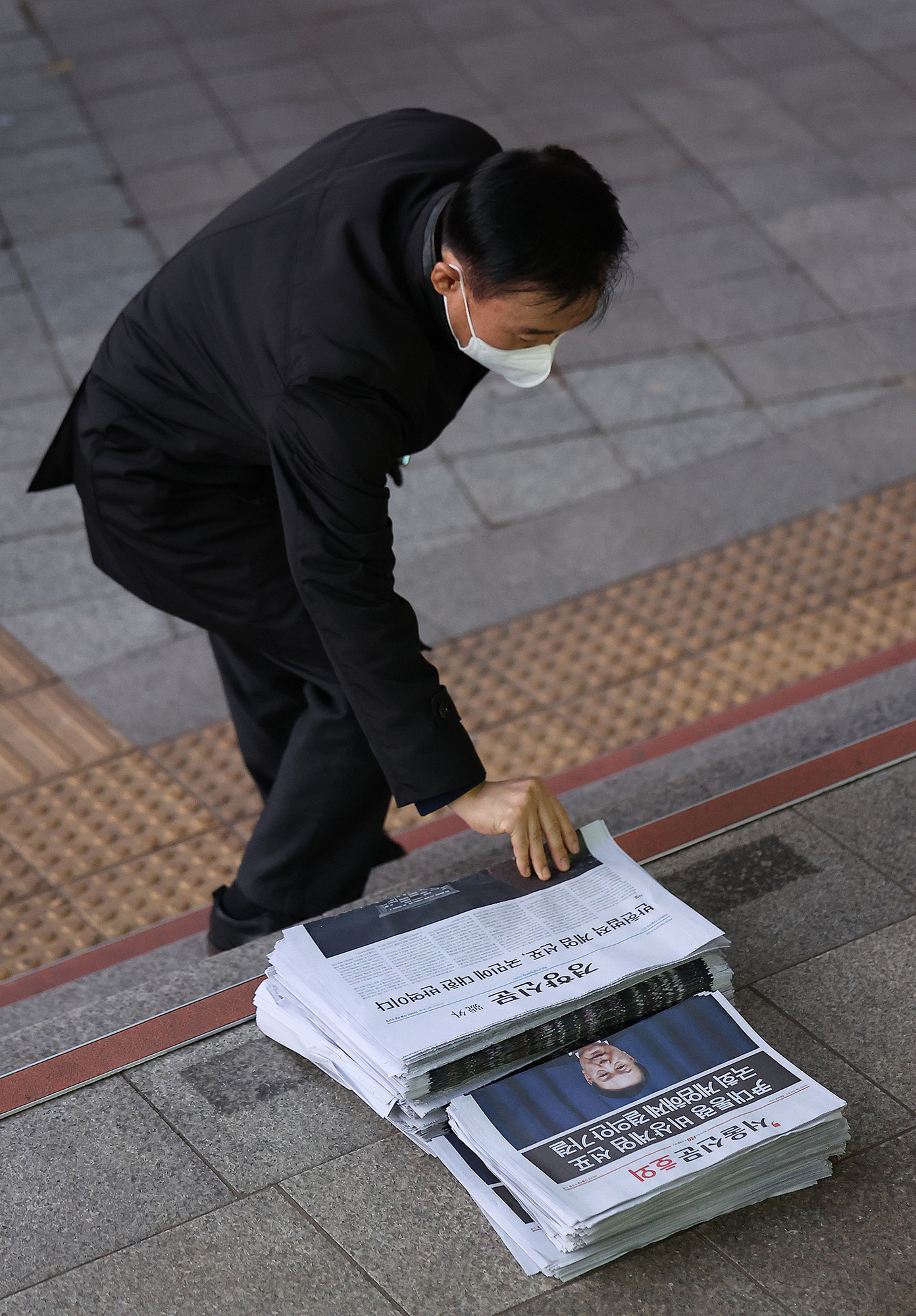 当地时间12月4日,韩国首尔,市民在光化门广场附近拿取有关解除紧急戒严令的公告。