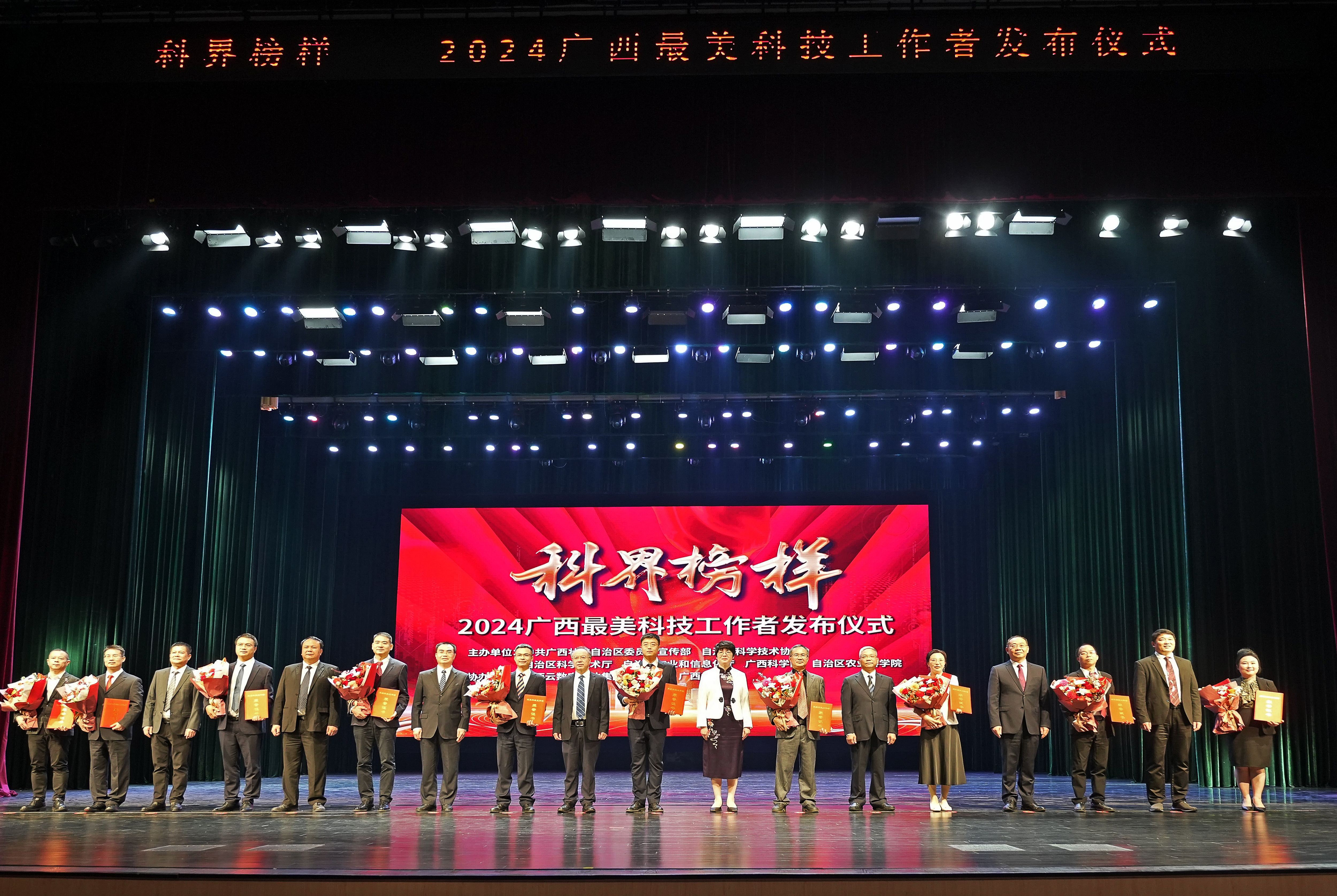 在2024广西最美科技工作者发布仪式上,获奖者与领导嘉宾合影。