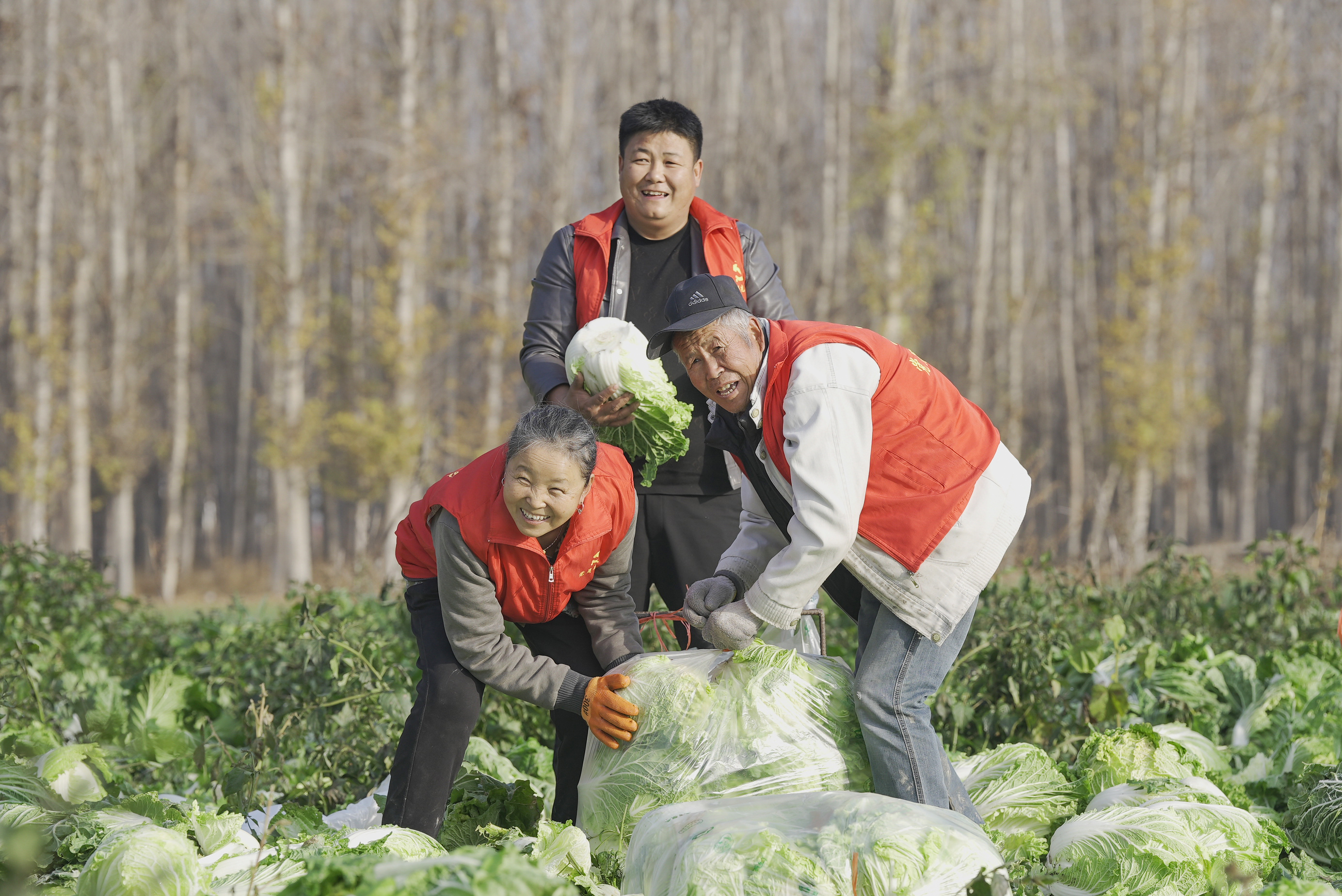新疆乌苏市皇宫镇泉水沟村种植的大白菜喜获丰收。该镇成立党员志愿服务队,帮助村民进行采收、分拣等工作。李仁锡摄