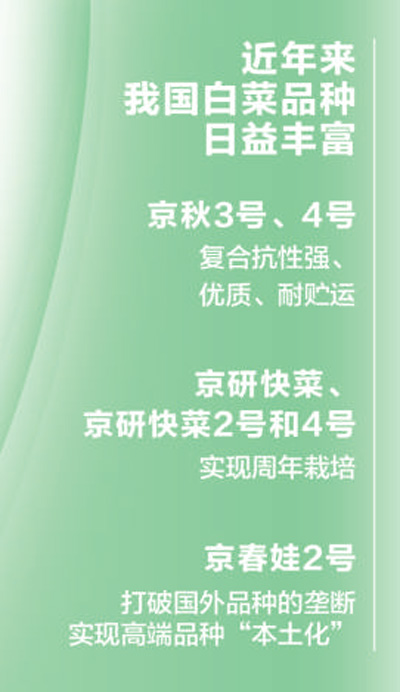 近年来,我国白菜育种实力突飞猛进,品种日益丰富,实现了从单一“秋播冬贮”向优势产区生产、产品多样化和周年生产转变。培育出了复合抗性强、优质、耐贮运的品种“京秋3号、4号”等,高品质、速生苗用品种“京研快菜、京研快菜2号和4号”3个品种搭配实现了周年栽培,解决了生产上长期缺乏冬春和夏季栽培专用品种的难题。还育成了娃娃菜、快菜、绍菜、金丝白等高品质品种,尤其是“京春娃2号”一举打破国外品种的垄断,它比国外品种早熟5至7天,种植密度高25%,亩收入增长30%,已成为国产娃娃菜第一大品种,实现了高端品种的“本土化”。