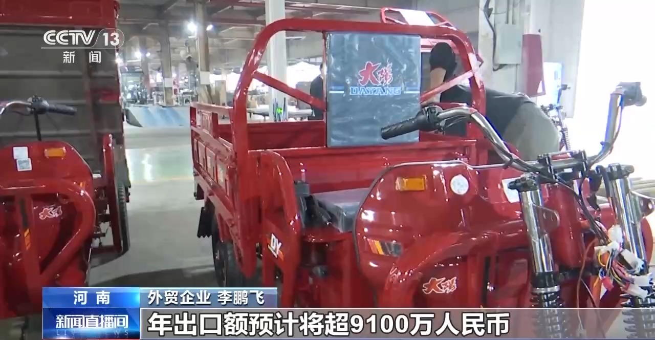 外贸企业 李鹏飞:海外不同地区对三轮摩托车的需求也不一样。像东南亚电动观光三轮摩托车居多,以支持当地旅游业发展;非洲三轮摩托车多用于货物运输,尺寸更大、更耐用;欧美国家农场多,城市街道相对狭窄,大马力、轻型化三轮摩托车的需求比较旺盛。今年前10个月,我们出口三轮摩托车整车1.3万辆,年出口额预计将超9100万元。