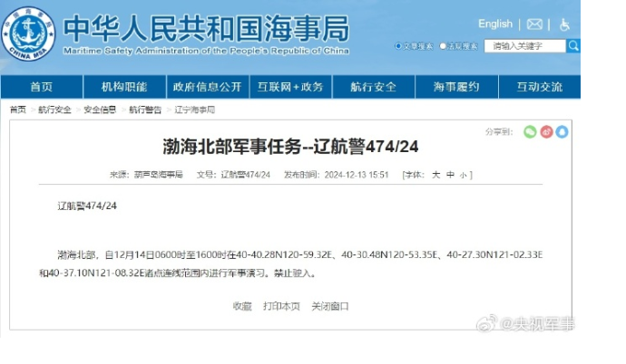 航行警告!渤海北部执行军事任务