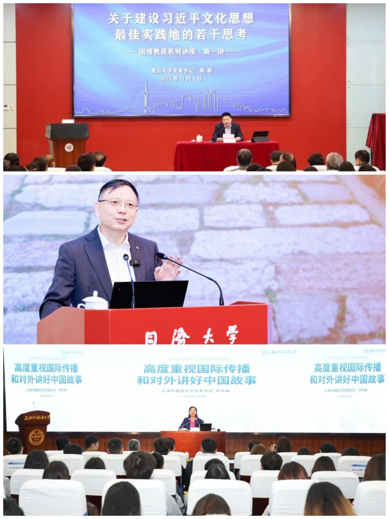 (从上至下)复旦大学党委书记裘新、同济大学党委书记方守恩、上海外国语大学党委书记尹冬梅在为学生做国情教育讲座。