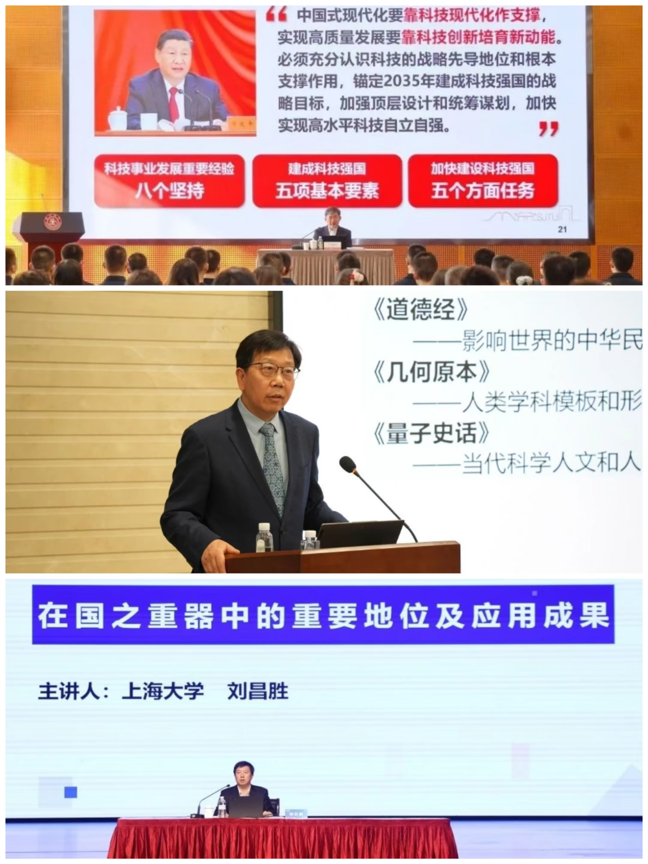 (从上至下)上海交通大学校长、中国科学院院士丁奎岭,华东师范大学校长、中国工程院院士钱旭红,上海大学校长、中国科学院院士刘昌胜在国情教育讲座中。