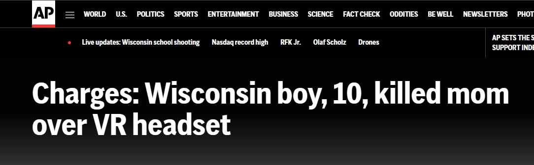 据美联社报道,2022年11月21日,在威斯康星州密尔沃基,一名10岁的男孩枪杀了母亲,只因没有给他买VR眼镜。