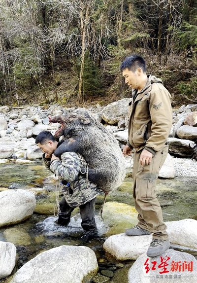 队员将猎捕到的野猪背过溪流。