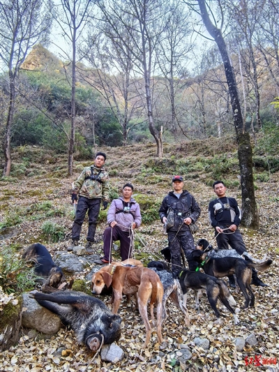 “今年已经没有打野猪了。”陕西汉中护农狩猎队的贾先生介绍,他在2019年成立了护农队,最多时有100多条猎犬,当地经过几年的野猪种群调控,今年发现的野猪已经很少了,“以前野猪很多,一天要接几十个村民的电话”。2023年,汉中市林业局发布的数据显示,该市组建专业狩猎队40支,共猎捕野猪1727头,猎捕量较2022年同期大幅上升,有效降低了野猪致害事件的发生率。