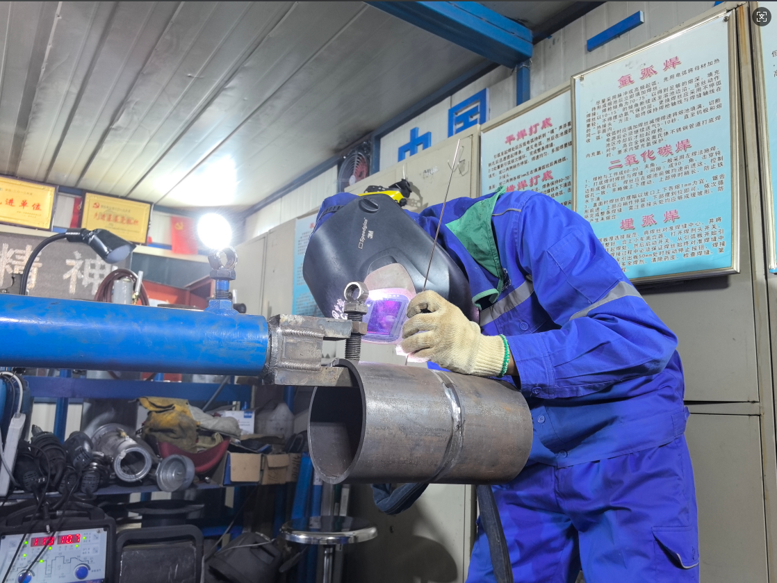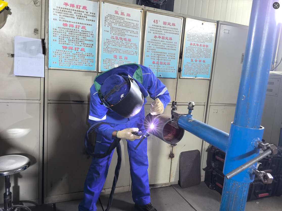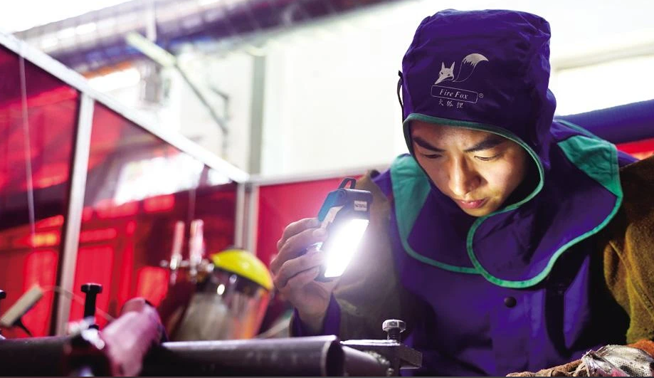 图为高磊在焊接钢管,以达到“单面焊双面成型”。记者 张枨摄