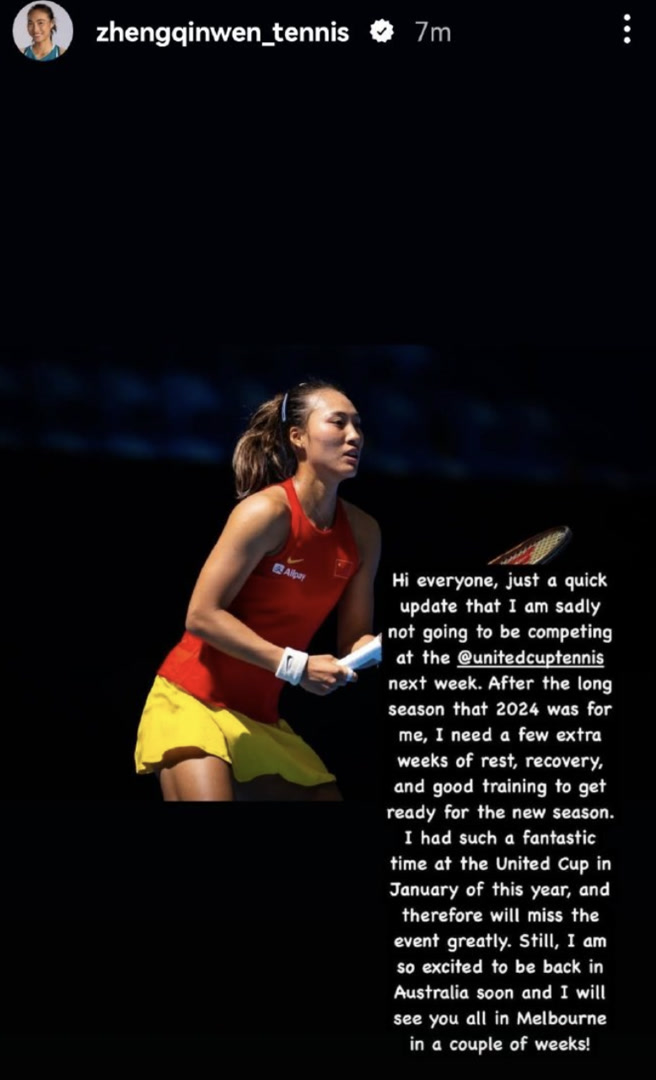 郑钦文在社交媒体上说,“大家好,很遗憾我将不会参加下周联合杯的比赛。在经历了漫长的2024赛季之后,我需要多几周的时间来休息和恢复,好好训练为新赛季做准备。今年1月,我在联合杯度过了一段美好的时光,因此我会非常想念这项赛事。不过我还是很高兴很快就能回到澳大利亚,几周后我们在墨尔本见。”