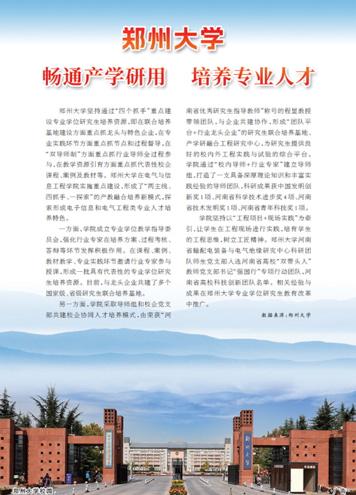 郑州大学坚持通过“四个抓手”重点建设专业学位研究生培养资源,即在联合培养基地建设方面重点抓龙头与特色企业,在专业实践环节方面重点抓节点和过程督导,在“双导师制”方面重点抓行业导师全过程参与,在教学资源引育方面重点抓代表性校企课程、案例及教材等。郑州大学在电气与信息工程学院实施重点建设,形成了“两主线、四抓手、一探索”的产教融合培养新模式,探索形成电子信息和电气工程类专业人才培养特色。
