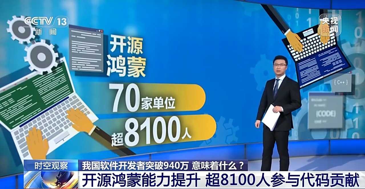 目前已有超过70家单位加入开源鸿蒙生态、超过8100人参与了代码贡献。那么我国软件开发者超940万意味着什么?来听中国互联网协会副理事长、伏羲智库主任李晓东的解读。