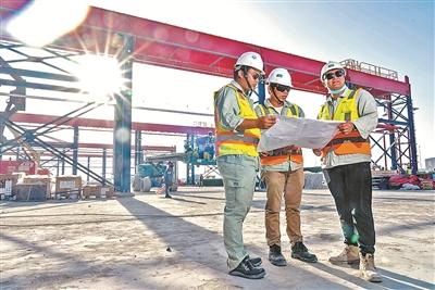 中国工程师在沙特国王港项目现场研究施工图纸。 |