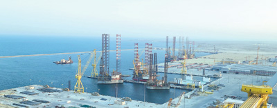 在沙特国王港项目1600吨龙门吊上远眺钻井平台停泊及检修区域。 |
