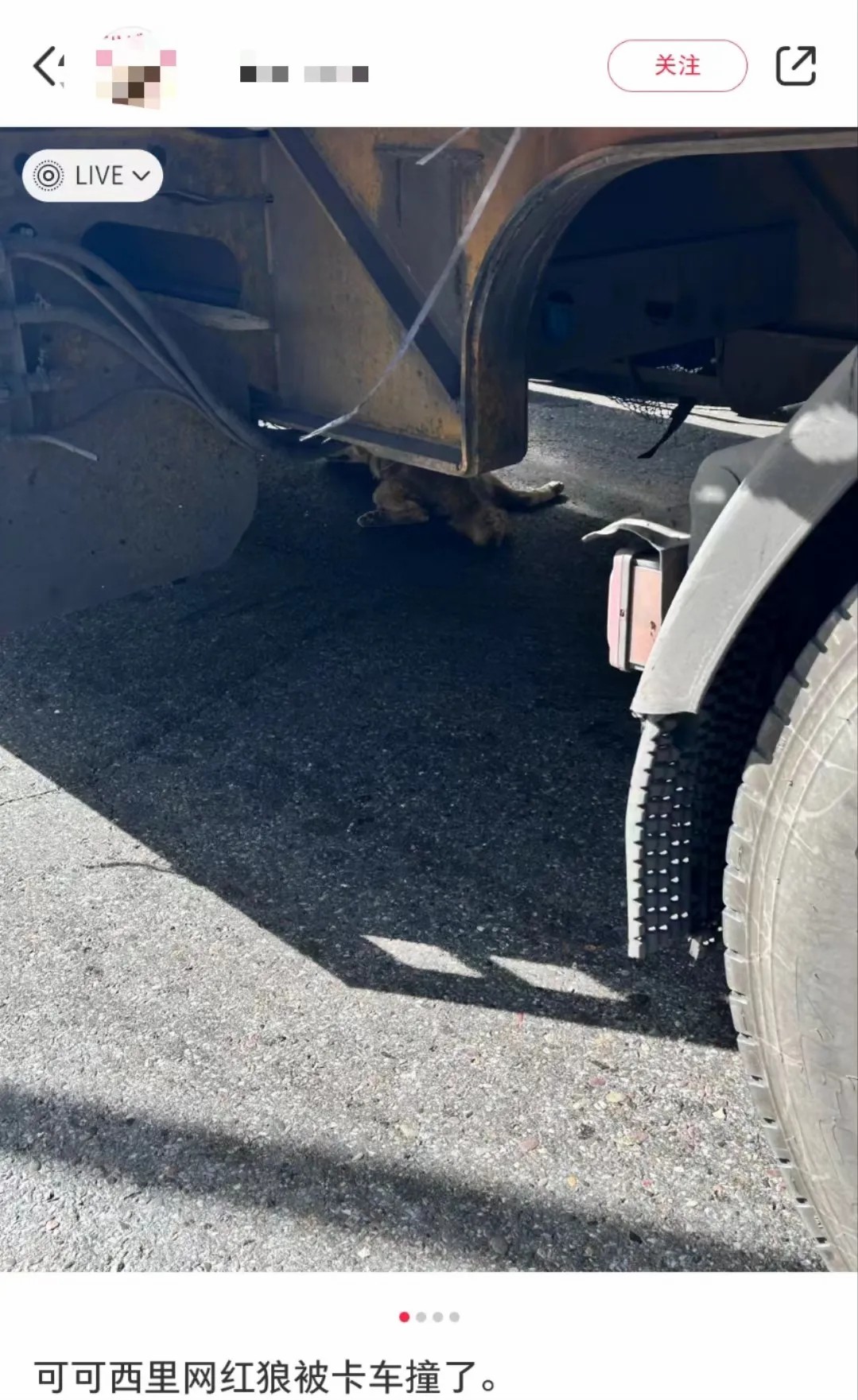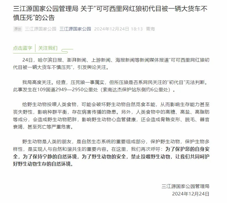 三江源国家公园管理局工作人员表示,目前在公路等待游客投喂的狼有四五只,被轧死的为其中一只,当时大货车司机发现狼后紧急刹车,但是已经来不及。