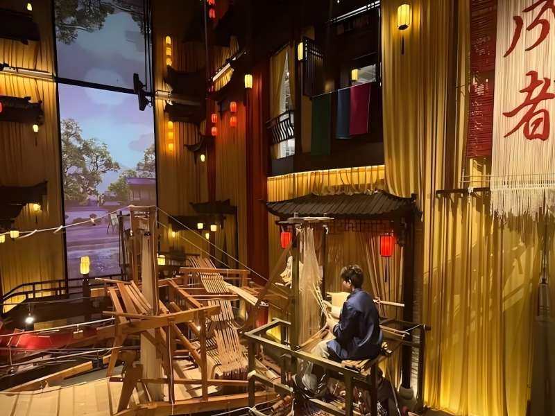 中庭织造展示区,数字大屏播放着锦官城街市熙攘的动画,非遗传承人曹代武和徒弟用一台清代道光年间的小花楼木织机演示传统织造流程。眼前是屋瓦飞檐、庭栏轩窗,耳边回荡着吱吱呀呀的织机声。“观感俱佳,仿佛穿越回古代的‘锦市’。”南京游客芮女士看得很仔细,她说,这样的参观让她流连忘返。