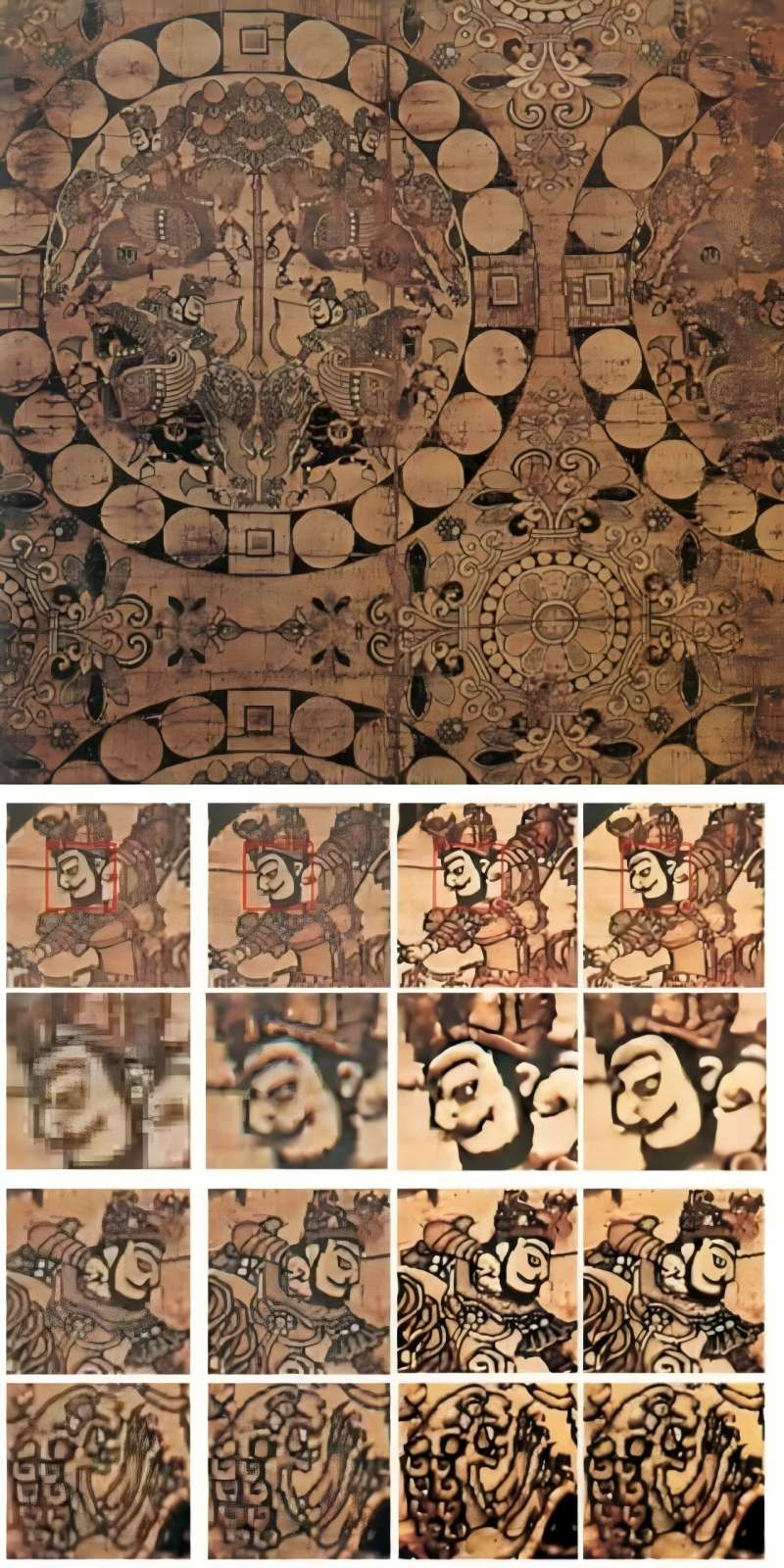一幅以传统方式复原的“四大天王狩猎纹锦”,乍一看,形态、色彩、人物刻画与残片纹样相似;仔细观察,图像粗糙、线条生硬、图中张弓搭箭作射狮状的胡人骑手表情呆滞,服饰上的文字模糊不清。而另一幅用数字技术复原的纹样,清晰度有很大提升,人物脸部细节精准,整体比例和谐。