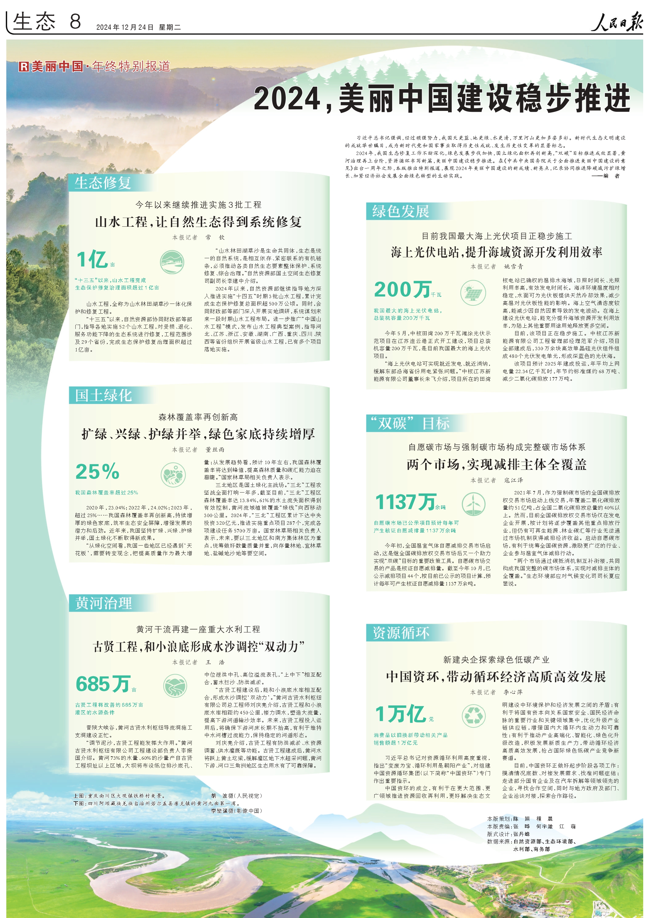 2024年,我国生态修复工作不断深化,绿色发展步伐加快,国土绿化面积再创新高,“双碳”目标推进成效显著,黄河治理再上台阶,资源循环书写新篇,美丽中国建设稳步推进。在《中共中央国务院关于全面推进美丽中国建设的意见》出台一周年之际,人民日报生态版推出特别报道,展现2024年美丽中国建设的新成绩、新亮点,记录协同推进降碳减污扩绿增长、加紧经济社会发展全面绿色转型的生动实践。